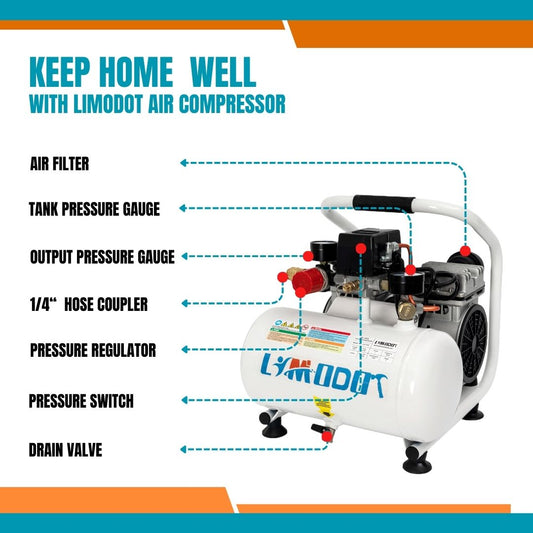 Limodot Ultra Quiet Air Compressor Portable, 60 dB, Silent and Electric for Car and Bike Tires, Nail Gun, and Pneumatic Tools, Garage, Shop, or Mechanic Accessories,