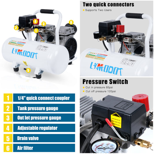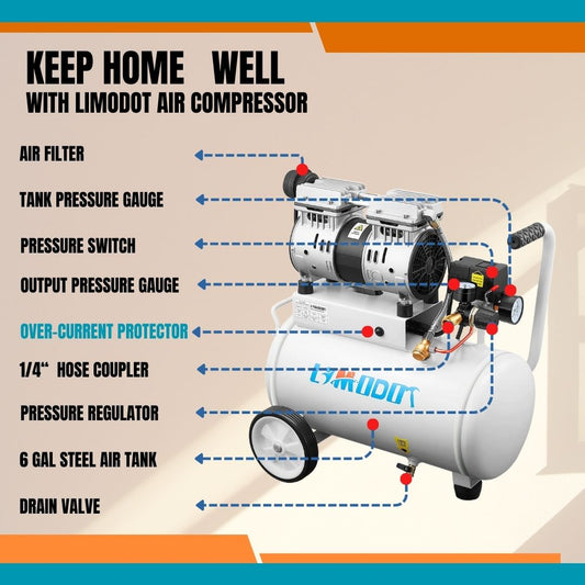 Limodot Air Compressor, Ultra Quiet Air Compressor, Only 68dB, 6 Gallon Durable Steel Air Tank, Fill In 80s, Fast 25s Recovery, Oil-Free, Ideal For Shop, Garage, Car, Pneumatic Tools
